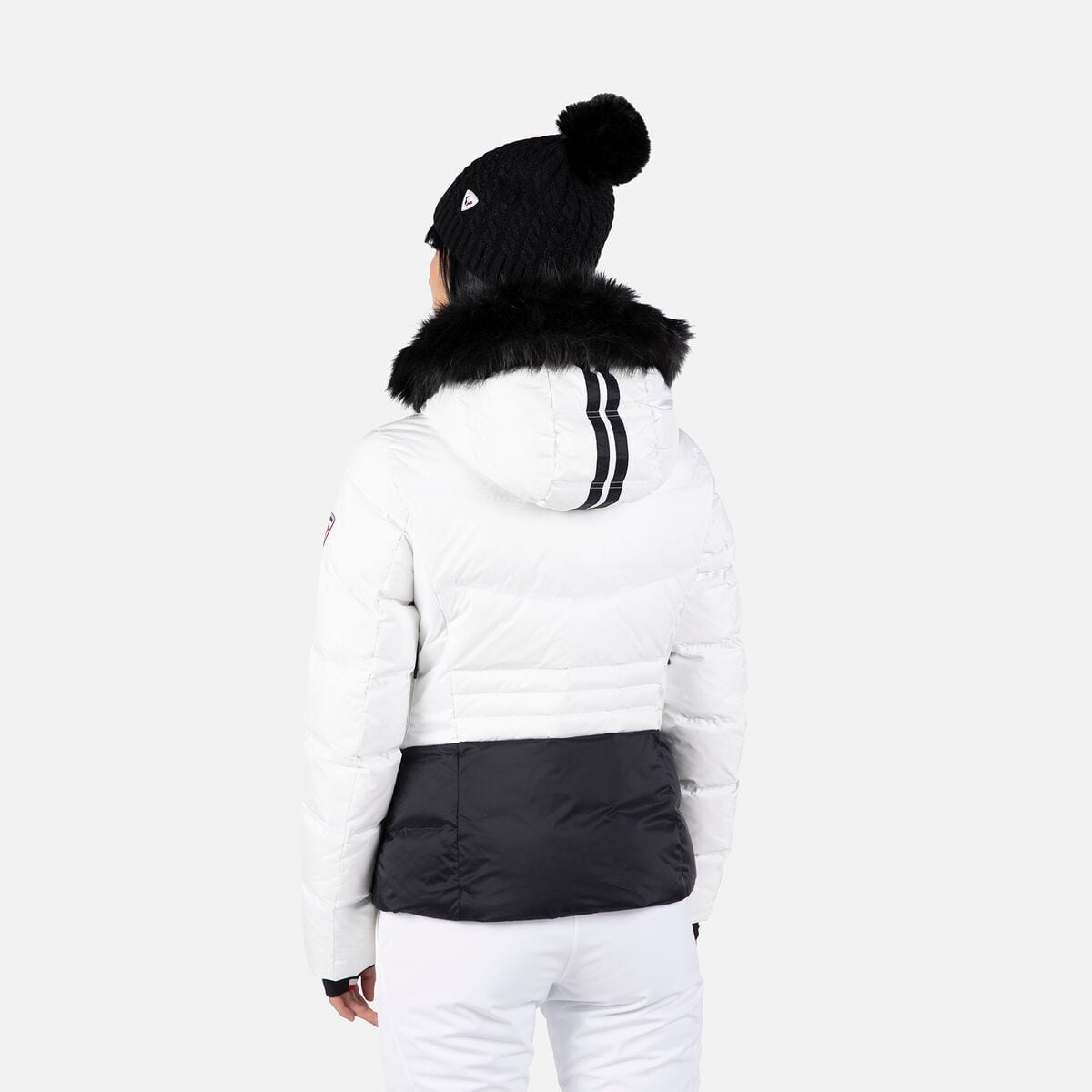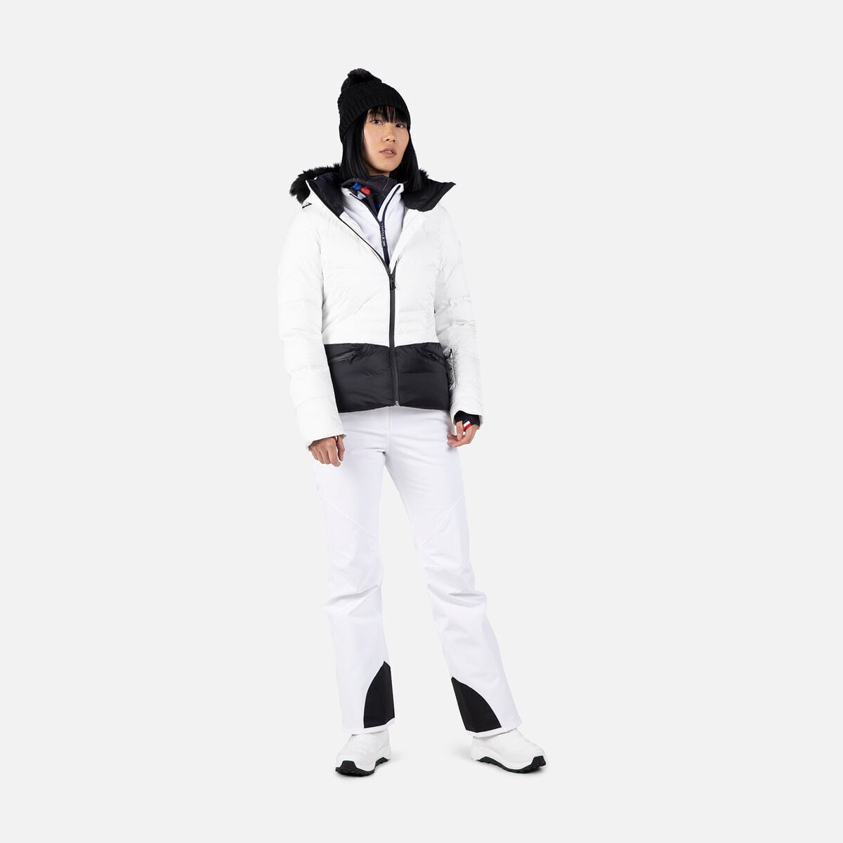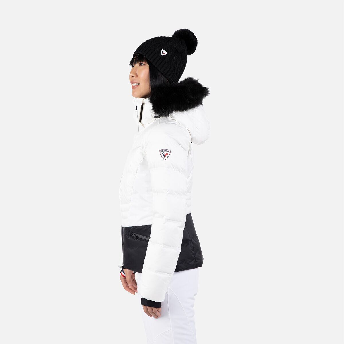シックで光沢のある素材と、重要な部分にはリアルダウンおよび合成断熱材を組み合わせています。ボディと袖にはフェザーウェイトがあり、サイドボディには通気性のある断熱材、そして快適さと温度調節をサポートするメリノウの裏地が施されています。四方向ストレッチソフトシェルゾーンは制限なくスキーを可能にし、取り外し可能なフェイクファーフードがラグジュアリーな印象を与えます。